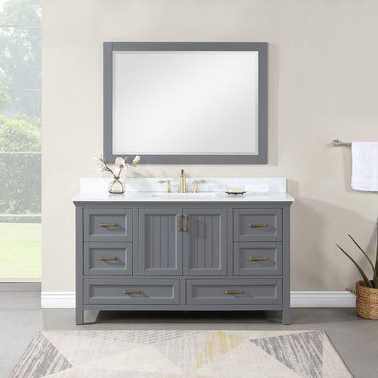 Altair Kinsley 60" Single Gray Freestanding Bathroom Vanity Set With Mirror, Aosta White Composite Stone Top, Rectangular Undermount Ceramic Sink, and Overflow