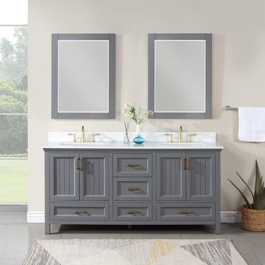 Altair Isla 72" Double Gray Freestanding Bathroom Vanity Set With Mirror, Aosta White Composite Stone Top, Two Rectangular Undermount Ceramic Sinks, and Overflow