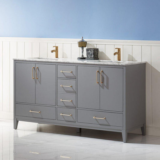 Altair Sutton 60" Double Gray Freestanding Bathroom Vanity Set With Natural Carrara White Marble Two Rectangular Undermount Ceramic Sinks, and Overflow