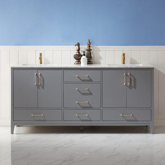 Altair Sutton 72" Double Gray Freestanding Bathroom Vanity Set With Natural Carrara White Marble Two Rectangular Undermount Ceramic Sinks, and Overflow