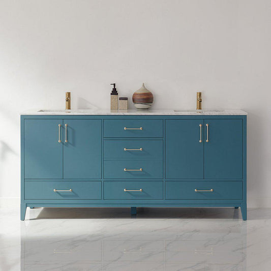 Altair Sutton 72" Double Royal Green Freestanding Bathroom Vanity Set With Natural Carrara White Marble Two Rectangular Undermount Ceramic Sinks, and Overflow