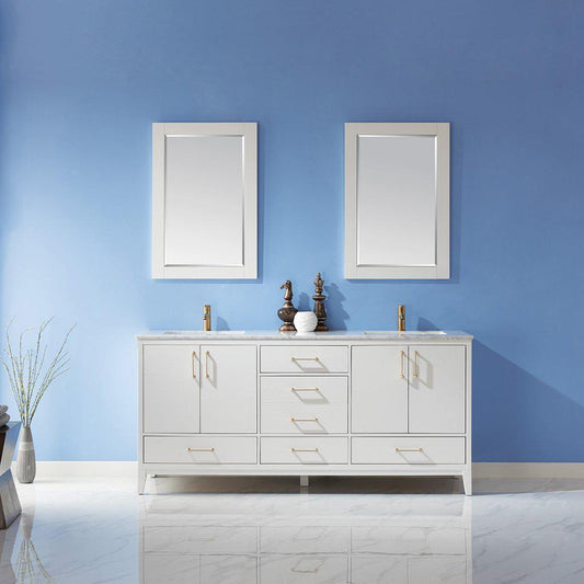 Altair Sutton 72" Double White Freestanding Bathroom Vanity Set With Mirror, Natural Carrara White Marble Two Rectangular Undermount Ceramic Sinks, and Overflow