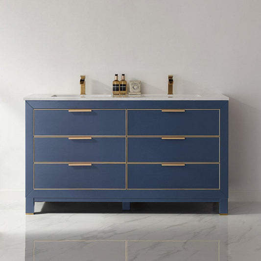 Altair Jackson 60" Double Royal Blue Freestanding Bathroom Vanity Set With Aosta White Composite Stone Top, Two Rectangular Undermount Ceramic Sinks, and Overflow