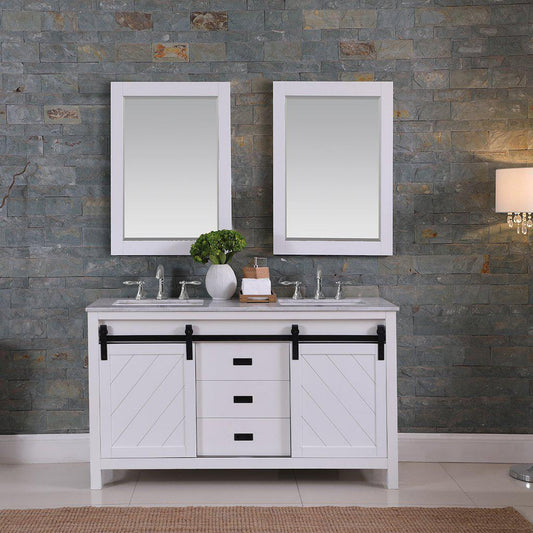 Altair Remi 60" Double White Freestanding Bathroom Vanity Set With Mirror, Natural Carrara White Marble Top, Two Rectangular Undermount Ceramic Sinks, and Overflow