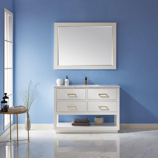 Altair Remi 48" Single White Freestanding Bathroom Vanity Set With Mirror, Natural Carrara White Marble Top, Rectangular Undermount Ceramic Sink, and Overflow