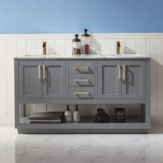 Altair Kinsley 60" Double Gray Freestanding Bathroom Vanity Set With Natural Carrara White Marble Top, Two Rectangular Undermount Ceramic Sinks, and Overflow