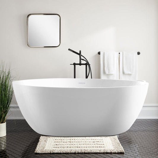 Vanity Art 59" x 22" White Acrylic Freestanding Contemporary Design Soaking Bathtub With Matte Black Slotted Overflow & Pop-up Drain