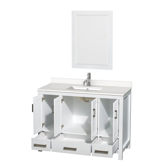 Wyndham Collection Sheffield 48" Single Bathroom Vanity in White, White Quartz Countertop, Undermount Square Sink, 24" Mirror
