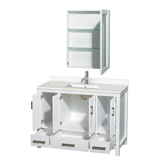 Wyndham Collection Sheffield 48" Single Bathroom Vanity in White, White Quartz Countertop, Undermount Square Sink, Medicine Cabinet