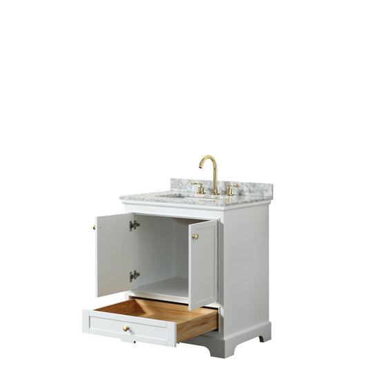 Wyndham Collection Deborah 30" Single Bathroom Vanity in White, White Carrara Marble Countertop, Undermount Oval Sink, Brushed Gold Trim, No Mirror