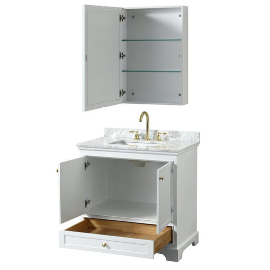 Wyndham Collection Deborah 36" Single Bathroom Vanity in White, White Carrara Marble Countertop, Undermount Oval Sink, Brushed Gold Trim, Medicine Cabinet