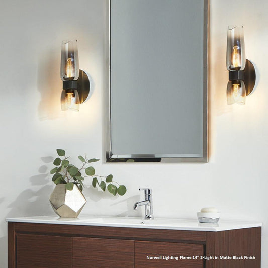 Norwell Lighting Flame 14" 2-Light Matte Black Vanity Wall Sconce With Clear/Chrome Gradient Diffuser