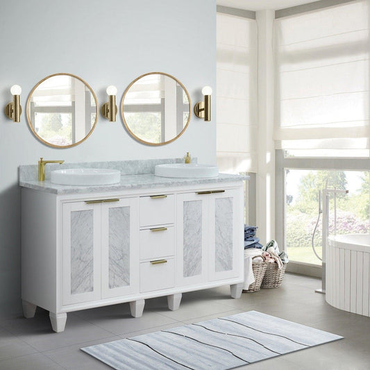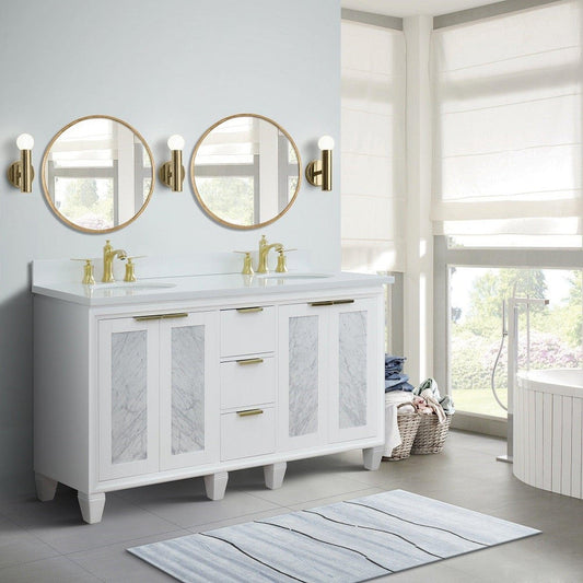 Bellaterra Home Trento 61" 4-Door 3-Drawer White Freestanding Vanity Set With Ceramic Double Undermount Oval Sink and White Carrara Marble Top