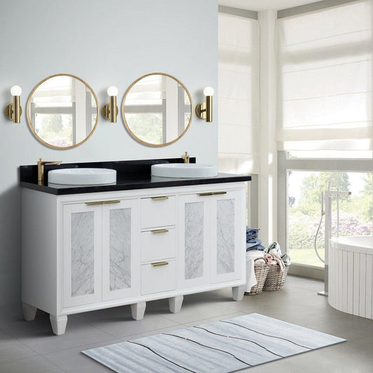 Bellaterra Home Trento 61" 4-Door 3-Drawer White Freestanding Vanity Set With Ceramic Double Vessel Sink and Black Galaxy Granite Top