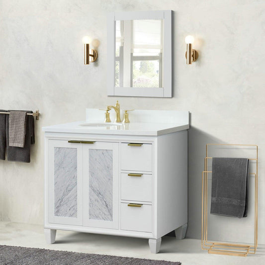 Bellaterra Home Trento 43" 2-Door 3-Drawer White Freestanding Vanity Set With Ceramic Left Undermount Oval Sink and White Carrara Marble Top, and Left Door Cabinet