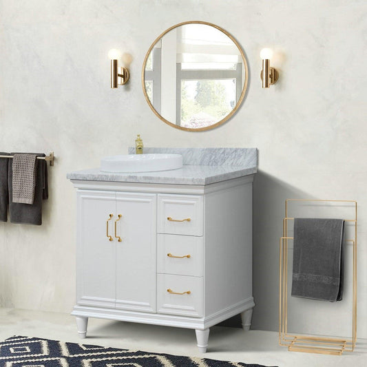 Bellaterra Home Forli 37" 2-Door 3-Drawer White Freestanding Vanity Set With Ceramic Left Offset Undermount Oval Sink and White Carrara Marble Top, and Left Door Cabinet