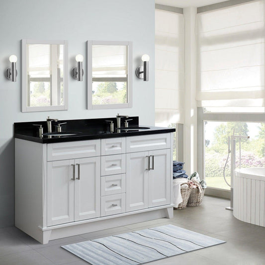 Bellaterra Home Terni 61" 4-Door 3-Drawer White Freestanding Vanity Set With Ceramic Double Undermount Oval Sink And Black Galaxy Granite Top