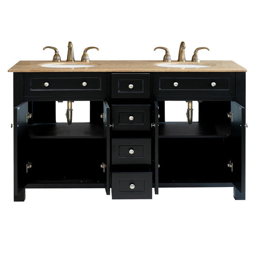 Bellaterra Home 62" 4-Door 4-Drawer Black Freestanding Vanity Set With White Ceramic Double Undermount Sink and Travertine Top