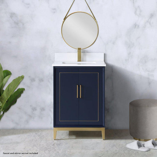 Bemma Design Gracie 24" Pacific Blue Solid Wood Freestanding Bathroom Vanity With Single 1-Hole White Quartz Vanity Top, Rectangle Undermount Sink, Backsplash and Satin Brass Trim