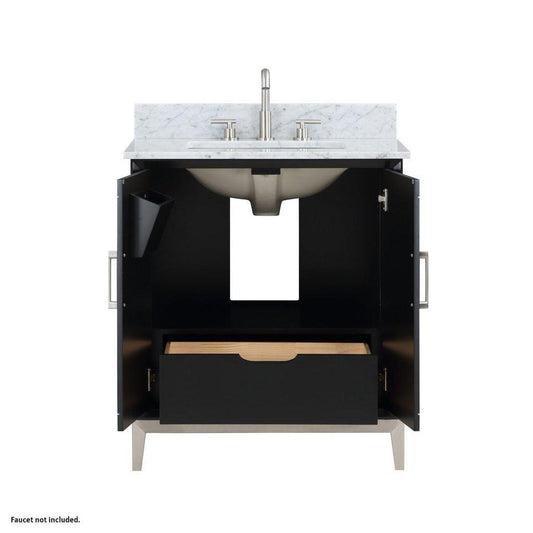 Bemma Design Gracie 30" Midnight Black Solid Wood Freestanding Bathroom Vanity With Single 3-Hole Italian Carra Marble Vanity Top, Rectangle Undermount Sink, Backsplash and Brushed Nickel Trim