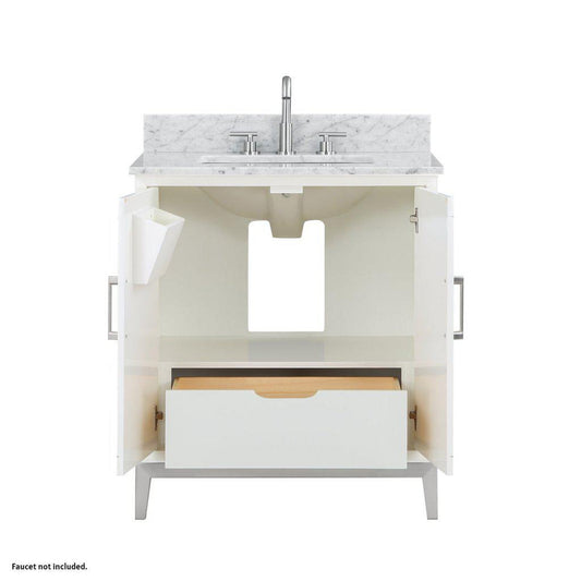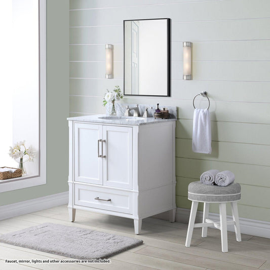Bemma Design Gracie 30" Satin White Solid Wood Freestanding Bathroom Vanity With Single 3-Hole Italian Carra Marble Vanity Top, Rectangle Undermount Sink, Backsplash and Brushed Nickel Trim