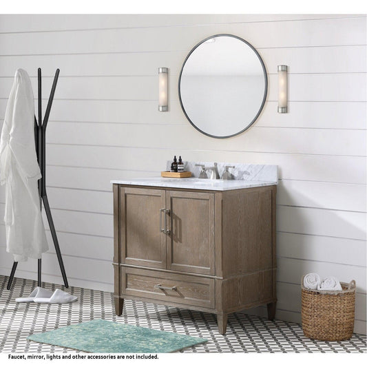 Bemma Design Montauk 36" Age Light Oak Solid Wood Freestanding Bathroom Vanity With Single 3-Hole Italian Carra Marble Vanity Top, Oval Undermount Sink, and Backsplash