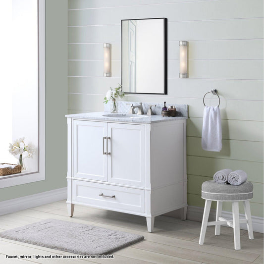 Bemma Design Gracie 36" Satin White Solid Wood Freestanding Bathroom Vanity With Single 3-Hole Italian Carra Marble Vanity Top, Rectangle Undermount Sink, Backsplash and Brushed Nickel Trim