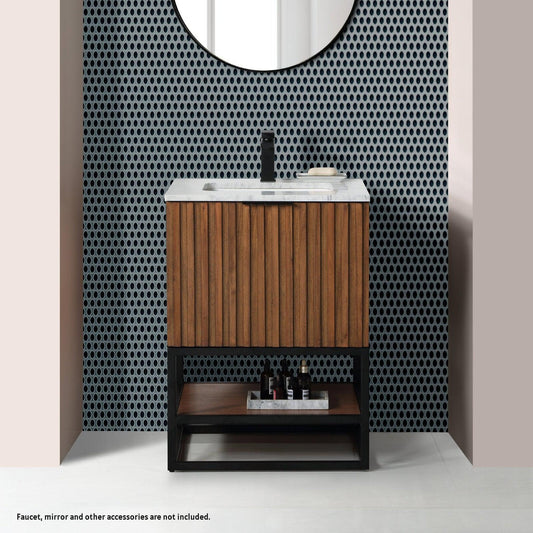 Bemma Design Terra 24" Walnut Solid Wood Freestanding Bathroom Vanity With Single 1-Hole Italian Carra Marble Vanity Top, Rectangle Undermount Sink and Matte Black Trim