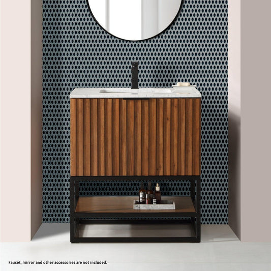 Bemma Design Terra 36" Walnut Solid Wood Freestanding Bathroom Vanity With Single 1-Hole Italian Carra Marble Vanity Top, Rectangle Undermount Sink and Matte Black Trim