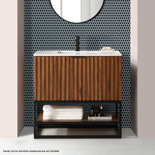 Bemma Design Terra 36" Walnut Solid Wood Freestanding Bathroom Vanity With Single 1-Hole White Quartz Vanity Top, Rectangle Undermount Sink and Matte Black Trim