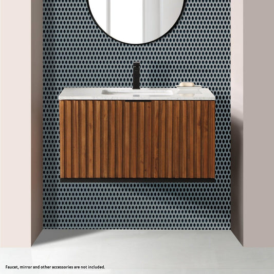 Bemma Design Terra 36" Walnut Solid Wood Wall-Mounted Bathroom Vanity With Single 1-Hole Italian Carra Marble Vanity Top, Rectangle Undermount Sink and Matte Black Trim