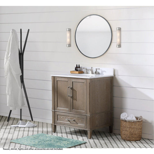 Bemma Design Montauk 30" Morning Fog Gray Solid Wood Freestanding Bathroom Vanity With Single 3-Hole White Quartz Vanity Top, Oval Undermount Sink, and Backsplash