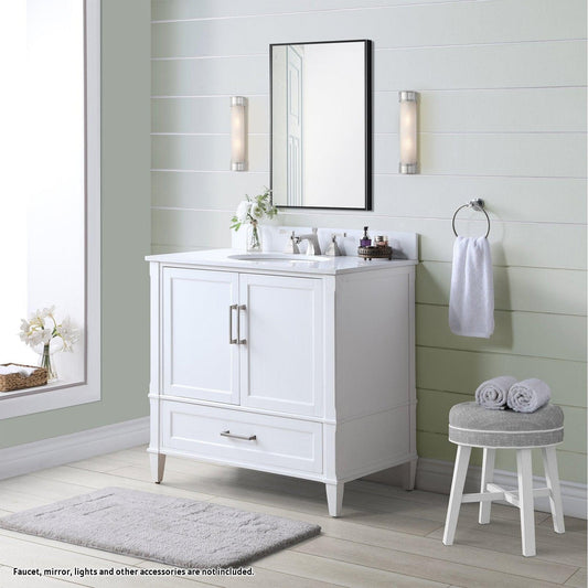 Bemma Design Montauk 36" Pure White Solid Wood Freestanding Bathroom Vanity With Single 3-Hole White Quartz Vanity Top, Oval Undermount Sink, and Backsplash