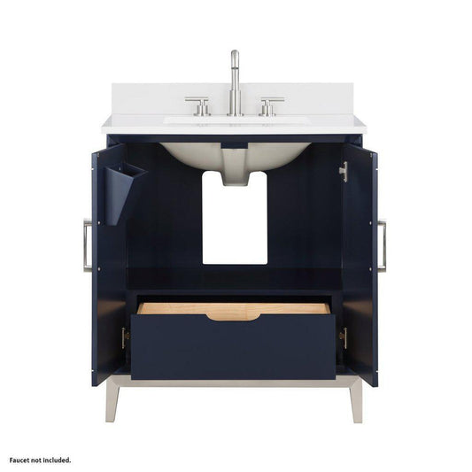 Bemma Design Gracie 30" Pacific Blue Solid Wood Freestanding Bathroom Vanity With Single 3-Hole White Quartz Vanity Top, Rectangle Undermount Sink, Backsplash and Brushed Nickel Trim