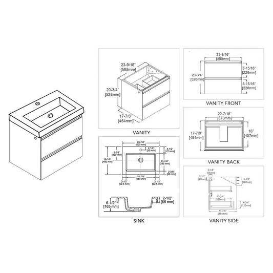 Blossom Jena 24" 2-Drawer Calacatta White Wall-Mounted Vanity Set With Acrylic Top and Integrated Single Sink