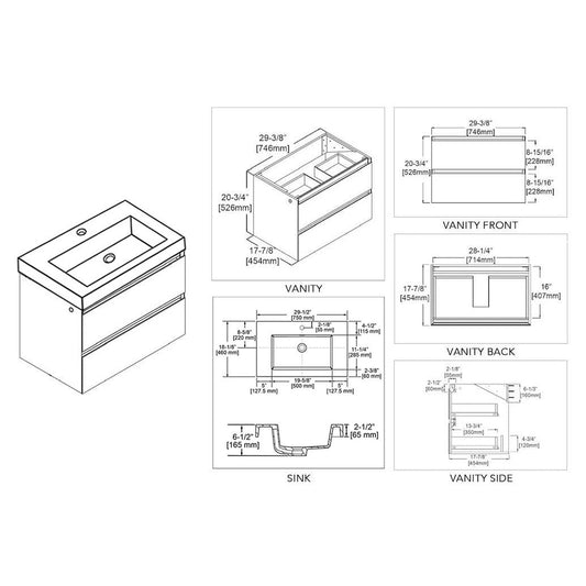 Blossom Jena 30" 2-Drawer Calacatta White Wall-Mounted Vanity Set With Acrylic Top and Integrated Single Sink