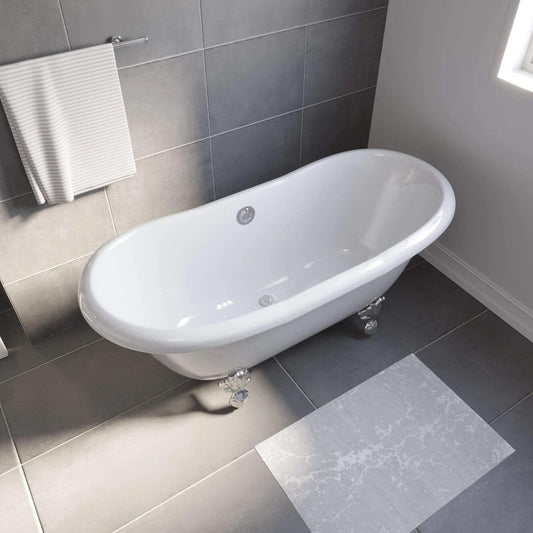 Cambridge Plumbing Amber Waves 68" Gloss White Acrylic Double Slipper Clawfoot Bathtub With No Deck Holes And Polished Chrome Clawfeet