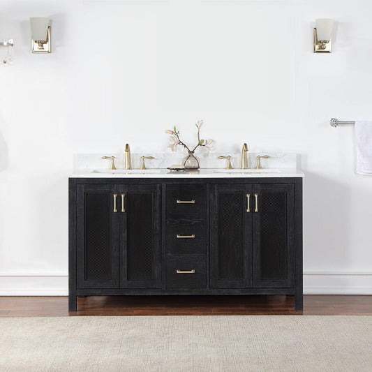 Altair Hadiya 60" Double Black Oak Freestanding Bathroom Vanity Set With Elegant Aosta White Composite Stone Top, Two Rectangular Undermount Ceramic Sinks, Overflow, and Backsplash