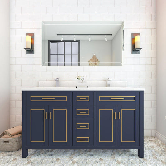 Duko Venice 60" Wooden Vanity Set With White Cararra Marble Tabletop, Rectangular Double Basin and Drawer Cabinet Blue