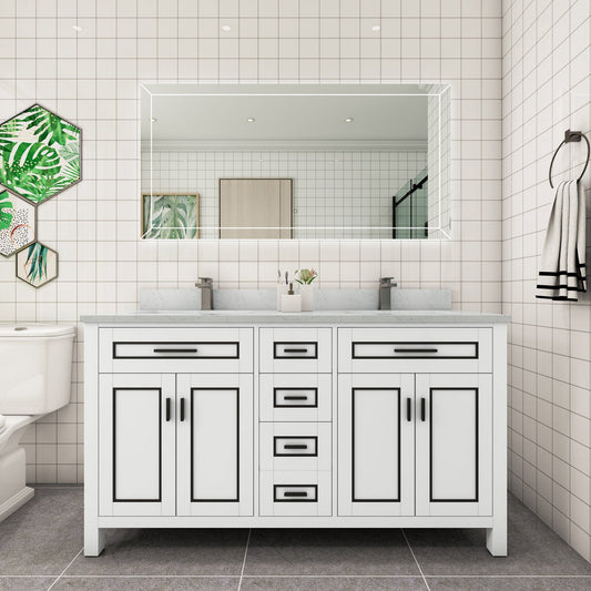 Duko Venice 60" Wooden Vanity Set With White Cararra Marble Tabletop, Rectangular Double Basin and Drawer Cabinet White