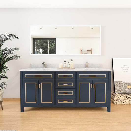 Duko Venice 72" Wooden Vanity Set With White Cararra Marble Tabletop, Rectangular Double Basin and Drawer Cabinet Blue