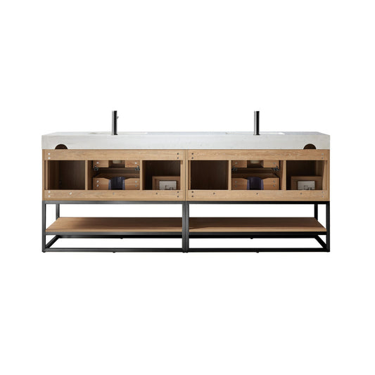 Vinnova Alistair 84" Double Sink Bath Vanity In North American Oak And Matte Black Finish With White Grain Stone Countertop