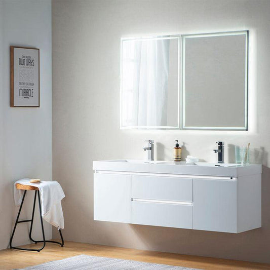 Alya Bath Ripley 60" Double White Modern Wall Mounted Bathroom Vanity With Integrated Acrylic Top, Acrylic Sink and Wall Mounted Mirror