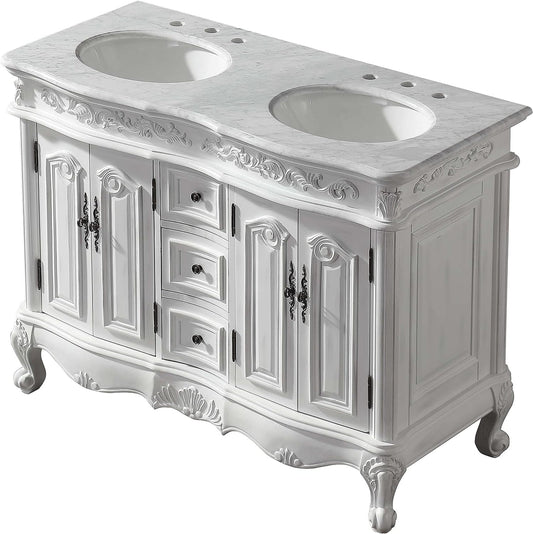 Silkroad Exclusive 48" Double Sink Antique White Bathroom Vanity With Carrara White Marble Countertop and White Ceramic Undermount Sink
