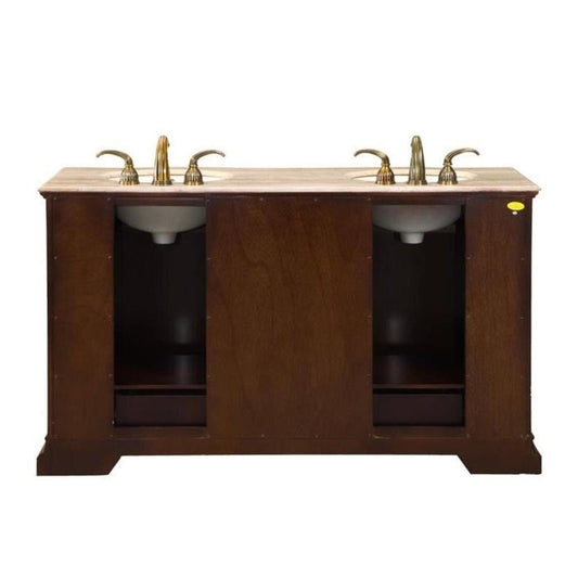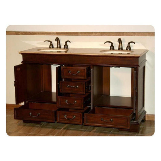 Silkroad Exclusive 60" Double Sink American Walnut Bathroom Vanity With Travertine Countertop and Ivory Ceramic Undermount Sink