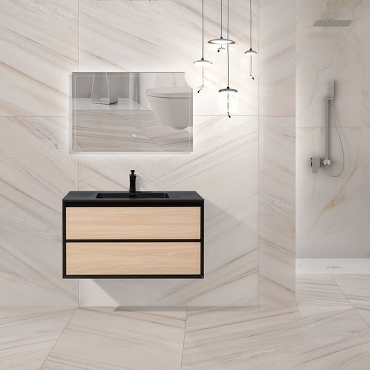 Duko Expect 36" Wooden Vanity Set With Black Single Basin and Drawer Cabinet Natural Oak