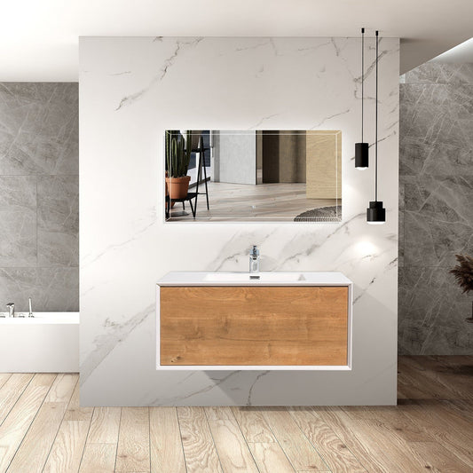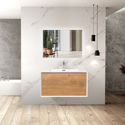 Duko Frula 36" Wooden Vanity Set With White Single Basin and Drawer Cabinet Oak