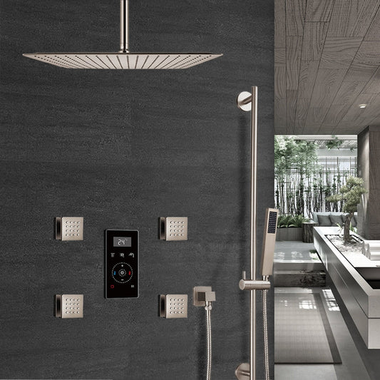 Fontana 24" Brushed Nickel Ceiling Mounted Rainfall Digital Control Shower System With 4-Jet Body Sprays, Hand Shower and Without Water Powered LED Lights