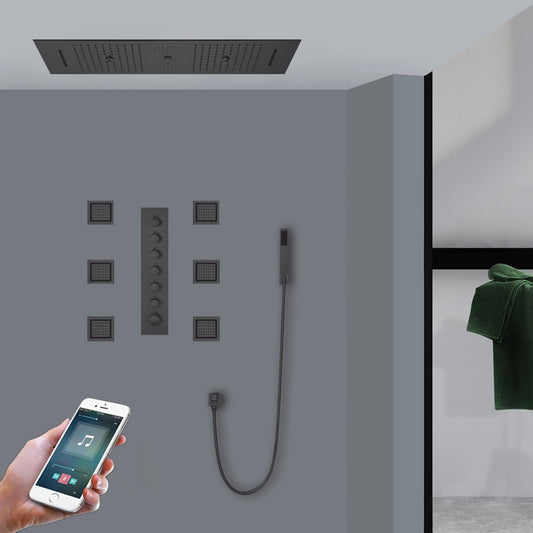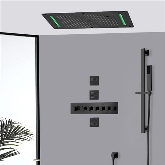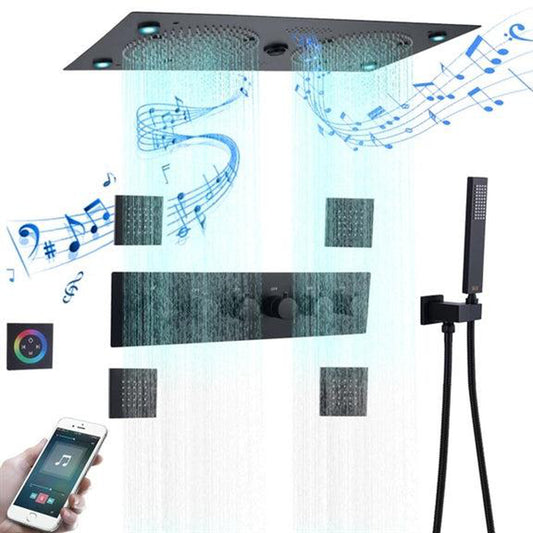 Fontana Ravenna Matte Black Large Recessed Ceiling Mounted Phone Controlled Thermostatic Musical LED Mist Waterfall Rainfall Shower System With Hand Shower and 3-Jet Body Sprays