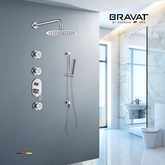 Fontana Bravat 10" Chrome Wall Mounted Thermostatic Rainfall Shower System With 3-Jet Body Sprays and Hand Shower